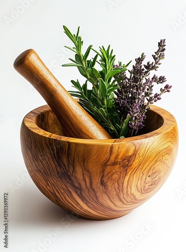 Beautiful display of rosemary and lavender in a wooden bowl with rustic mortar for natural remedies : Generative AI