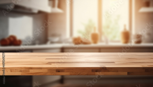 Beautiful empty brown wooden table top and blurred defocused modern kitchen interior background with daylight flare, product montage display. generative ai
