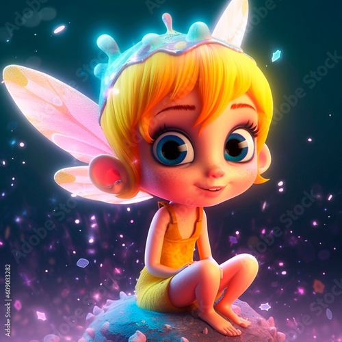 Beautiful fairy tale character 3d illustration. Magic fairy print for clothes, stationery, books. Magic fairy print for girls. Fairy 3d character banner, background. Generative ai.