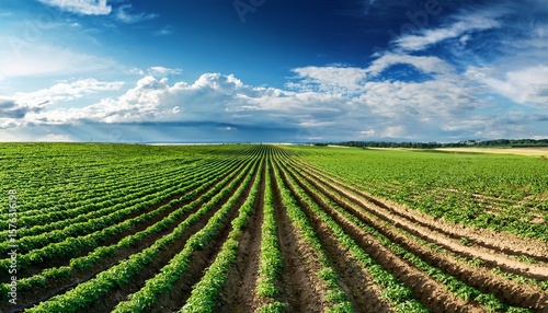 beautiful farmland landscape with green rows of potato and vegetables on a spring or summer farm field and nice blue cloudy sky on background