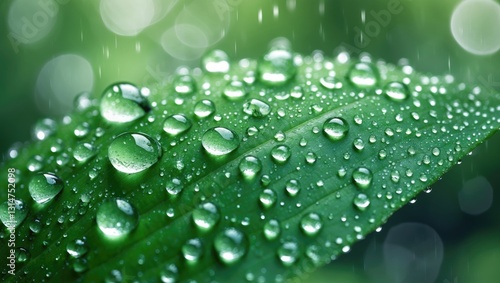 Beautiful features of nature. Morning dew drops on a fresh green leaf. Summer nature macro design, fresh rain drops on green leaf. Peaceful and tranquil ecology. Relaxing soft blue-green.
