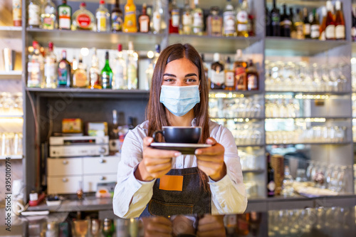 Beautiful female barista is holding a cup with hot coffee, looking at camera and wearing protective face mask while standing near the bar counter in cafe