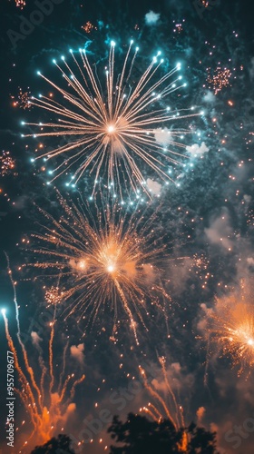 Beautiful fireworks at night during a holiday. Fireworks exploding in the air full of lights and sparkle in celebration of the special day.