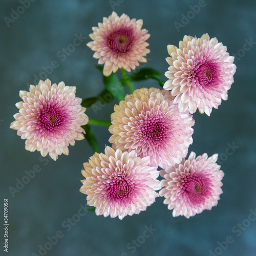 Beautiful flat lay top down view of colorful vintage looking dahlia flower with contrasting background