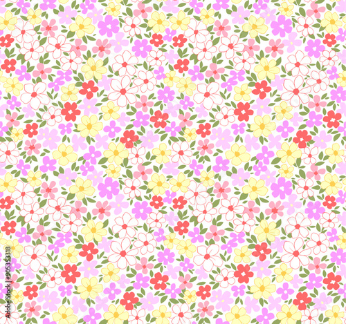 Beautiful floral pattern in small abstract flowers. Small light pink and yellow flowers. White background. Ditsy print. Floral seamless background. Vintage template for fashion prints. Stock pattern.