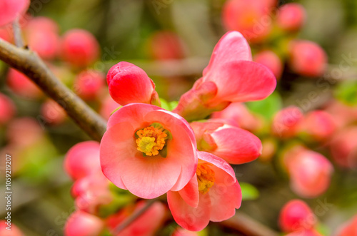 Beautiful floral spring abstract background of nature. Branches of pink cherry blossoming with soft focus on background.