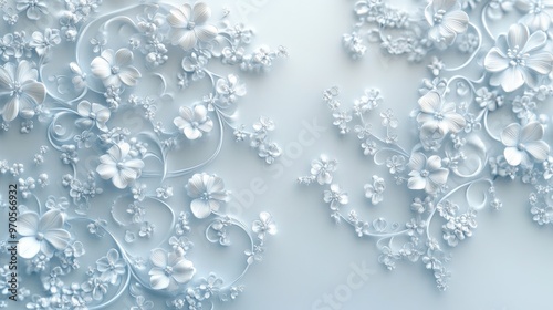 Beautiful floral swirls of tiny flowers forming delicate patterns, set against a soft white-light blue background for an elegant look