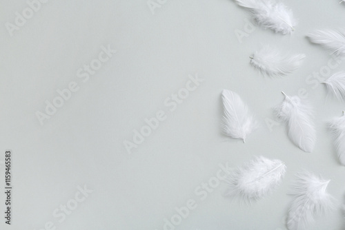 Beautiful fluffy feathers on light grey background, flat lay. Space for text