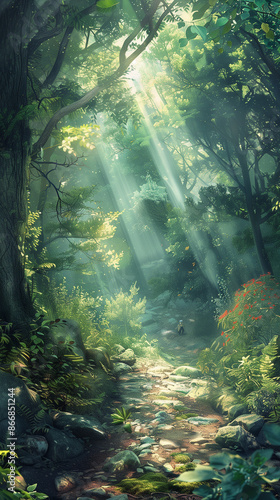 beautiful forest scenery with sunbeams shining through the canopy, created with generative AI technology
