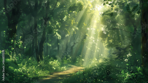 beautiful forest scenery with sunbeams shining through the canopy, created with generative AI technology