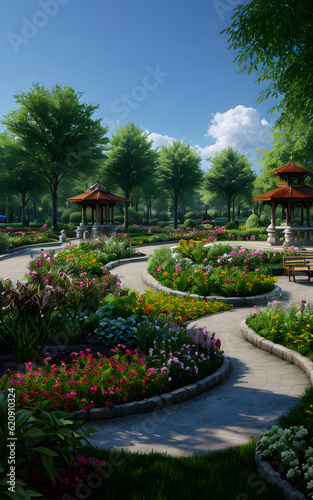 Beautiful garden park environment by green foliage of trees and flowers thrive