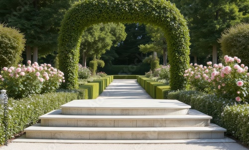 Beautiful garden path with blooming roses