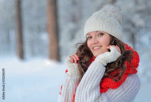 beautiful girl in winter forest in the snow smiling looking at the frame