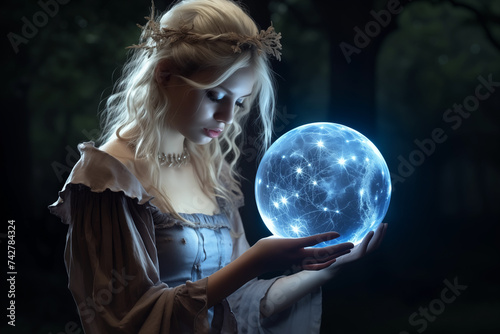 Beautiful girl on a night with a magic ball. Astrology and Zodiac Concept. Generative Ai.