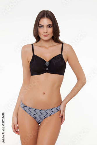 beautiful girl posing in stylish designed chic black bikini on white background.