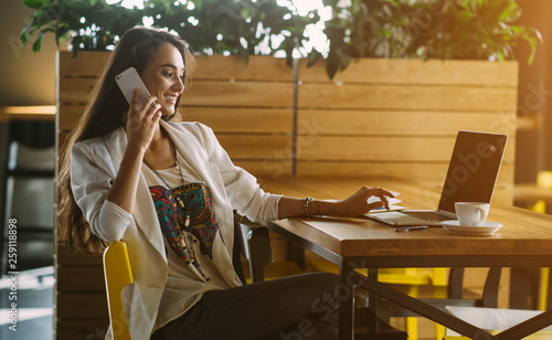 Beautiful girl working out a plan of the project and concept. Girl paints a website design on a laptop. student prints a message on the phone in the messenger. Development. Digital marketing