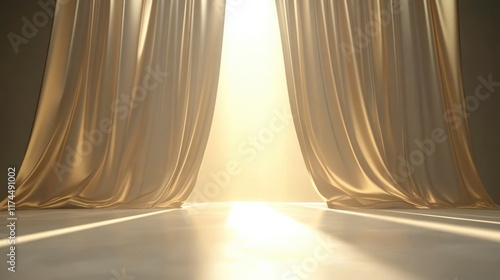 Beautiful Golden Curtains Parting to Reveal Bright Light in a Luxurious Setting, Symbolizing Hope, Opportunity, and New Beginnings, Captivating and Inspirational Scene