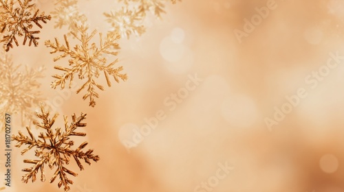 Beautiful golden snowflakes gently falling against a soft blurred background, creating a serene winter atmosphere