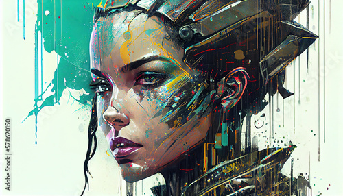 Beautiful Gorgeous Female Soldier Face in Futuristic Robotic Helmet of Watercolor Art AI Generative