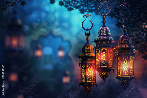 Beautiful greeting card with holiday composition for happy celebrate Ramadan, abstract vivid composition consists of fictional unreal fantastic vision on background