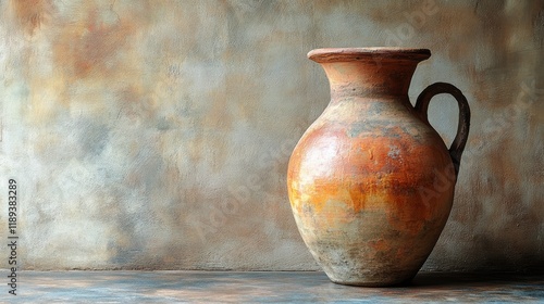 Beautiful handcrafted clay pot displayed against a textured wall in warm tones