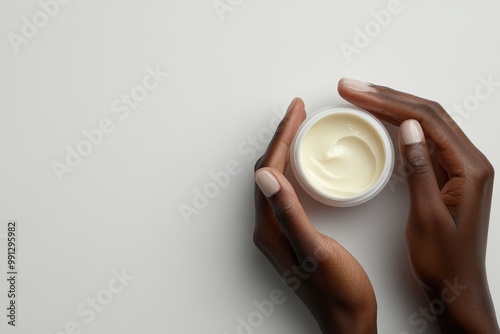 Beautiful hands holding a jar of cream, showcasing luxury skincare and self-care rituals on a soft, minimal background.