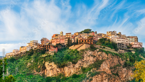 beautiful highland landscape of old town on a top of amazing mountain with green slopes and trees on foreground and amazing blue cloudy sky on background