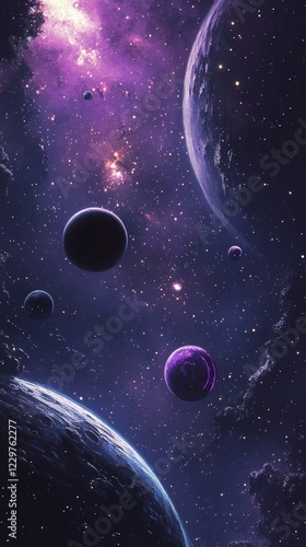 Beautiful illustration of a cosmic scene with planets, stars, and nebulae. Ideal for sci-fi, astronomy, and fantasy-related projects or educational materials.