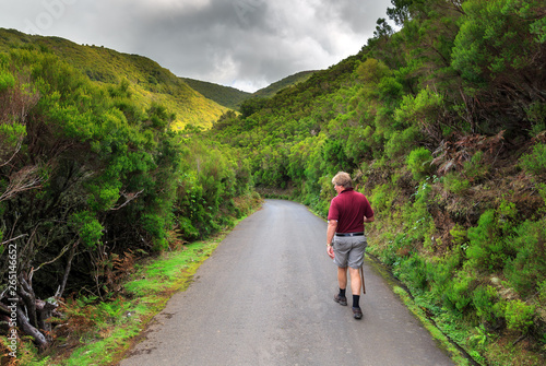 Beautiful landscape view of a hiking senior tourist on the 25 Fontes levada trail on the green island Madeira