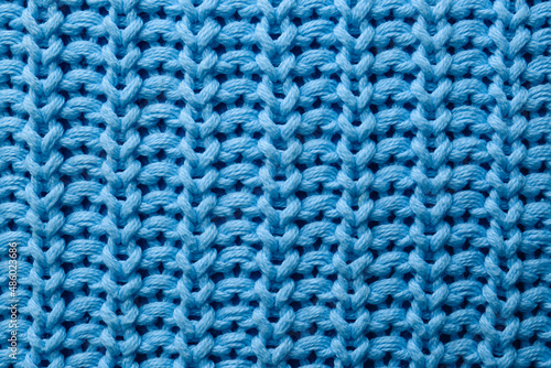 Beautiful light blue knitted fabric as background, top view