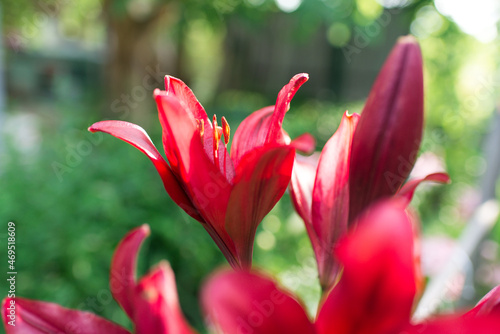 Beautiful lily flower on a background of green leaves. Lily flowers in the garden. Background texture with burgundy buds. Image of a flowering plant with crimson flowers of a varietal lily.