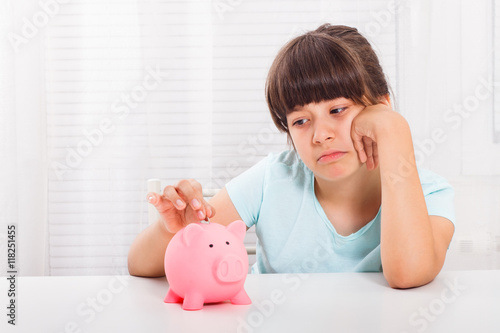 Beautiful little girl is very sad because she didn't save enough money to buy something.