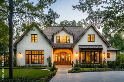 Beautiful modern home exterior during twilight with warm lights and lush landscaping in a serene residential neighborhood