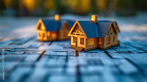 beautiful modern home placed on an architectural blue print, transformation copy space
