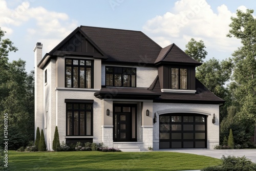 Beautiful modern two-story house featuring a blend of brick and sleek black accents surrounded by lush greenery in a serene suburban neighborhood