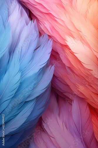 Beautiful multicolour feathers background in pastel colors. Closeup vertical image of colorful fluffy feather. Minimal abstract composition with place for text. Copy space