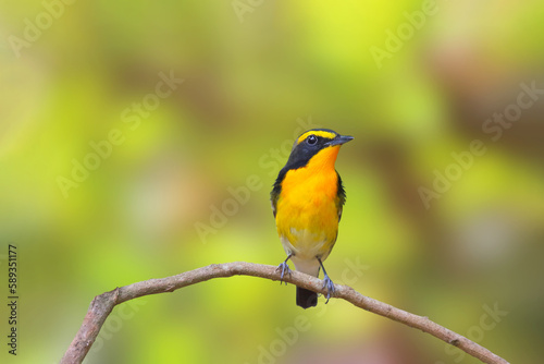 Beautiful narcissus flycatcher bird perched on a branch in tropical forest.