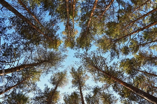 Beautiful natural forest background. Coniferous trees on a beautiful sunny day. Relaxation in nature.