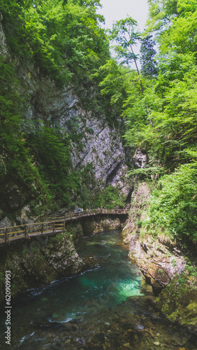 Beautiful nature landscape of a river going across the gorge with a runaway on the wall