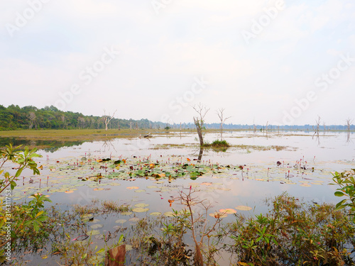 Beautiful nature landscape view of lake pond at Neak Poan in Angkor Wat complex, Siem Reap Cambodia.