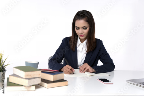 Beautiful office woman sit at table in office ,she work with laptop and use pen write report on notebook.