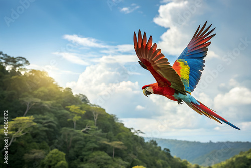 Beautiful parrots fly high in the sky.