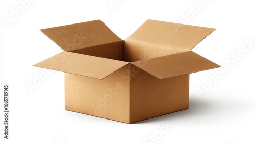Beautiful photo of open cardboard box isolated on white background perfect for use in packaging design, shipping services, moving company ads, or e-commerce product presentation.