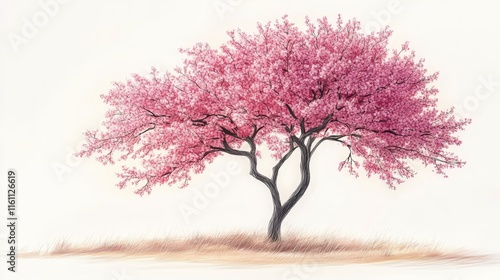 Beautiful Pink Blossom Tree on White Background in Soft Pastel Style
