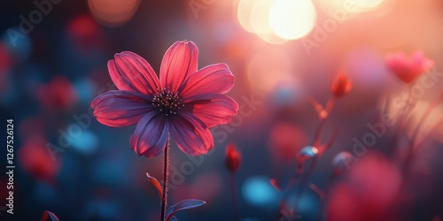Beautiful pink flower blooming in a serene meadow during sunset with soft bokeh background effects