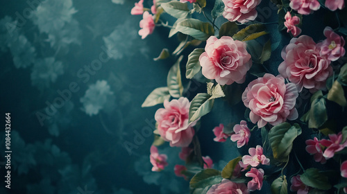 Beautiful pink roses adorn a textured blue wall in a serene indoor setting