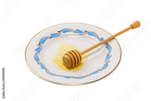 Beautiful plate with wooden spoon for honey isolated on transparent background.