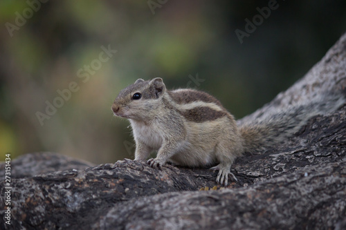 Beautiful Portrait of a Squirrel on the Tree Trunk against a soft green blurry background