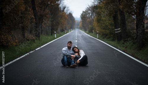Beautiful portrait of young couple hugging while sitting on a perfect clean long road between the green forest in autumn