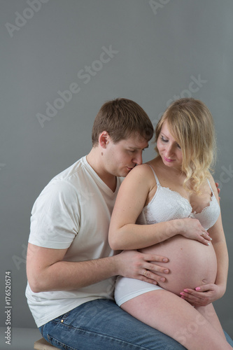 Beautiful pregnant couple in love on the background.Hands of husband on the tummy of his pregnant wife. Young man tenderly stroked pregnant belly of his wife. Husband kissing pregnant belly.